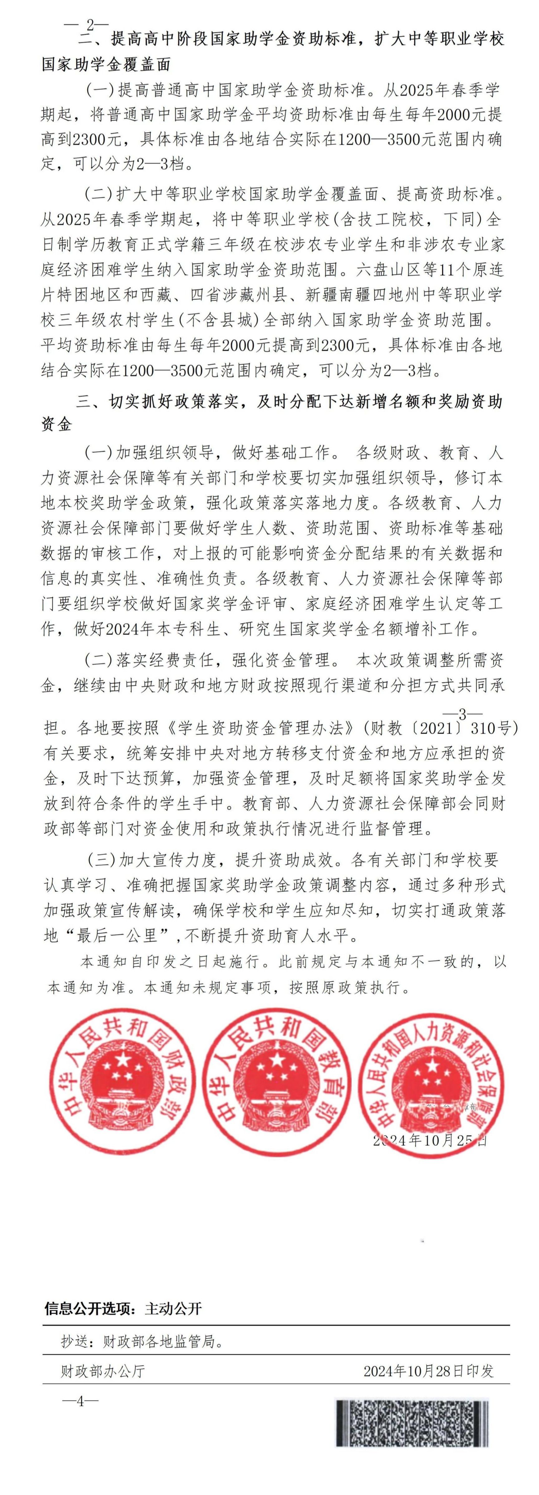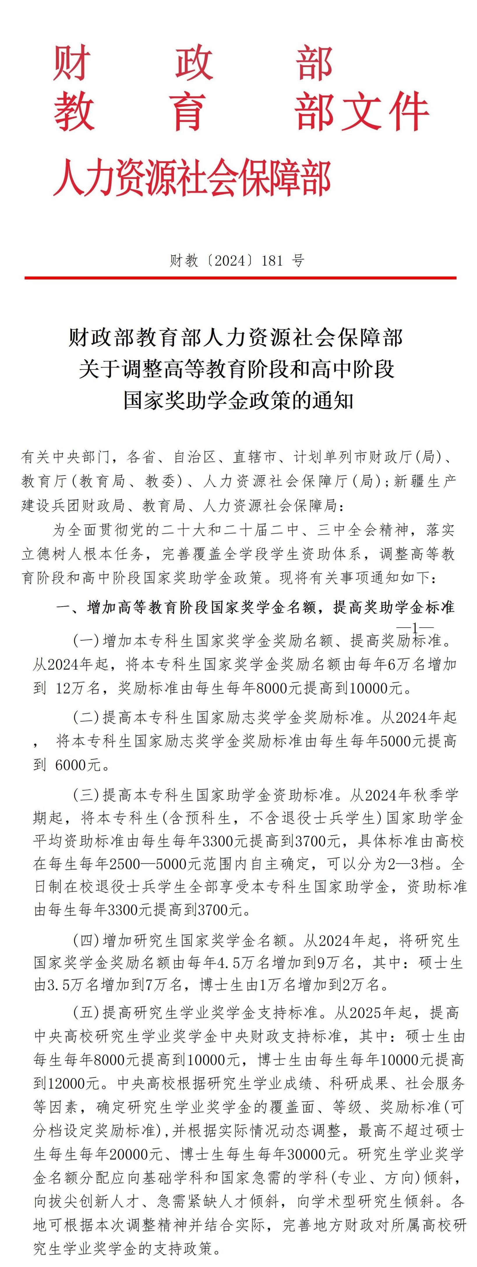 财政部、教育部、人力资源社会保障部关于 调整高等教育阶段和高中阶段国家奖助学金政策的通知